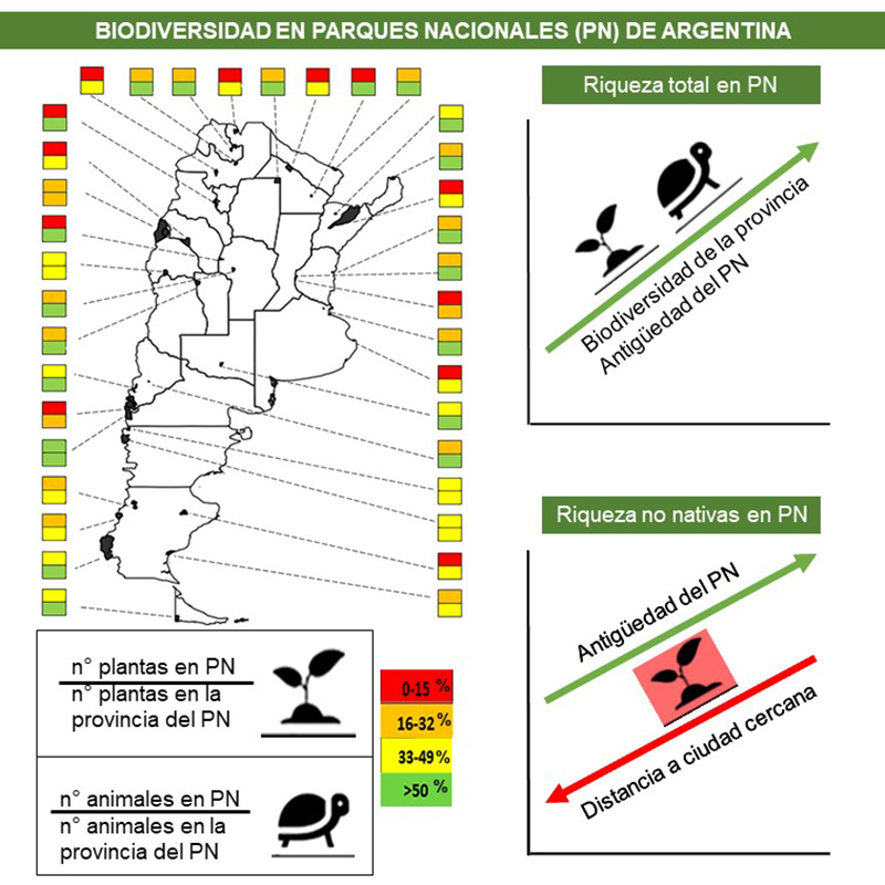 M&M: Los registros de plantas vasculares y de vertebrados, las características de cada PN y la riqueza de especies de la provincia donde se encuentra cada PN se obtuvieron de bases de datos de acceso abierto. Para los PN Calilegua, Iguazú y Nahuel Huapi describimos el número de plantas según familia, origen, endemismo, forma de vida, estado de conservación según UICN e invasividad de especies no nativas.