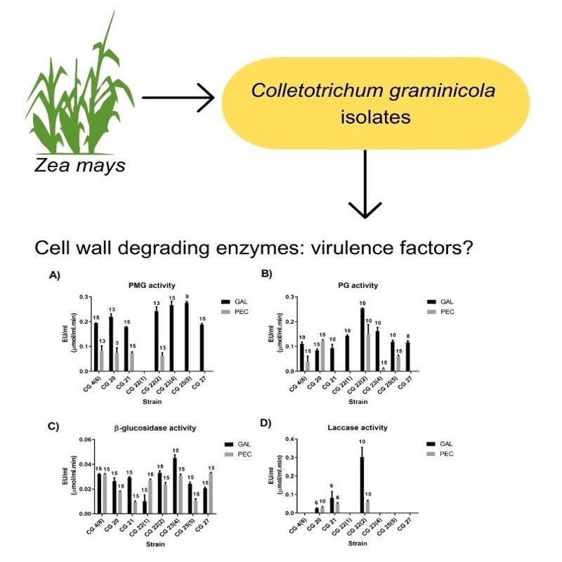 Introducción y objetivos: Colletotrichum graminicola (Glomerellaceae, Glomerellales) el agente causal de la antracnosis del maíz es dependiente de la actividad de enzimas degradadoras de la pared celular vegetal, para penetrar en su hospedante. La producción de estas enzimas se considera un factor de virulencia. El objetivo del presente trabajo fue investigar si existe variabilidad entre aislamientos en la capacidad de crecimiento y producción in vitro de diversas enzimas involucradas en la degradación de pared celular vegetal.